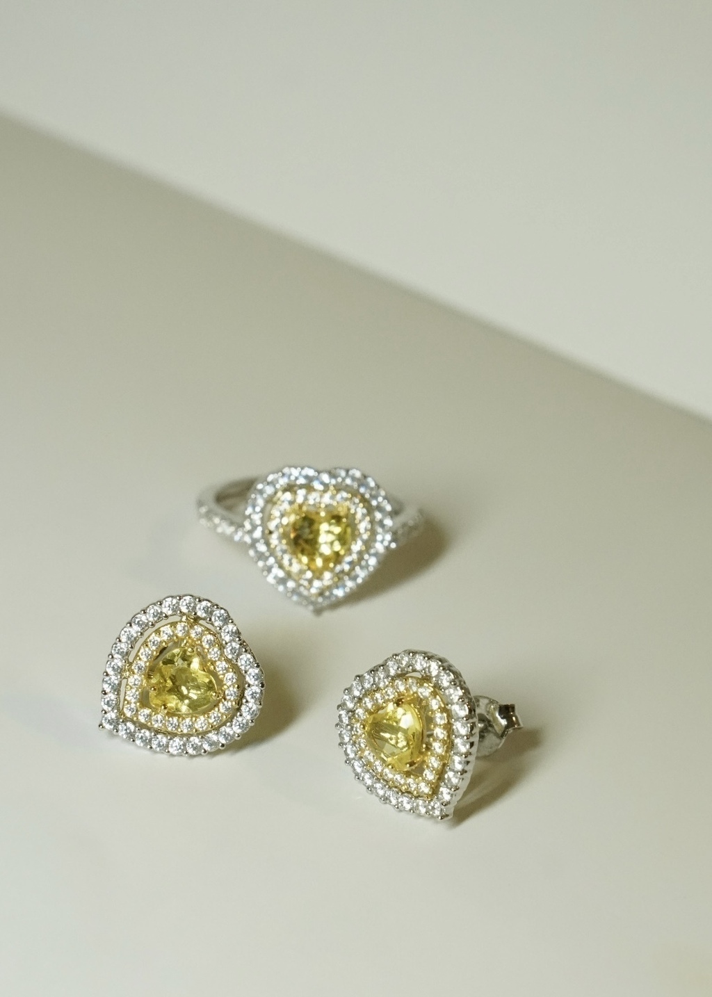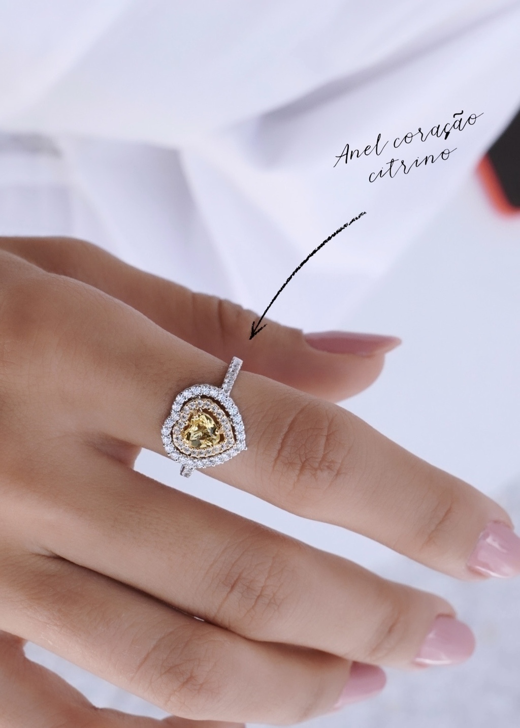 Design: coração duplo cravejada com pedra de citrino no centro. Banho do aro externo em ródio branco e interno no banho de ouro 18k.